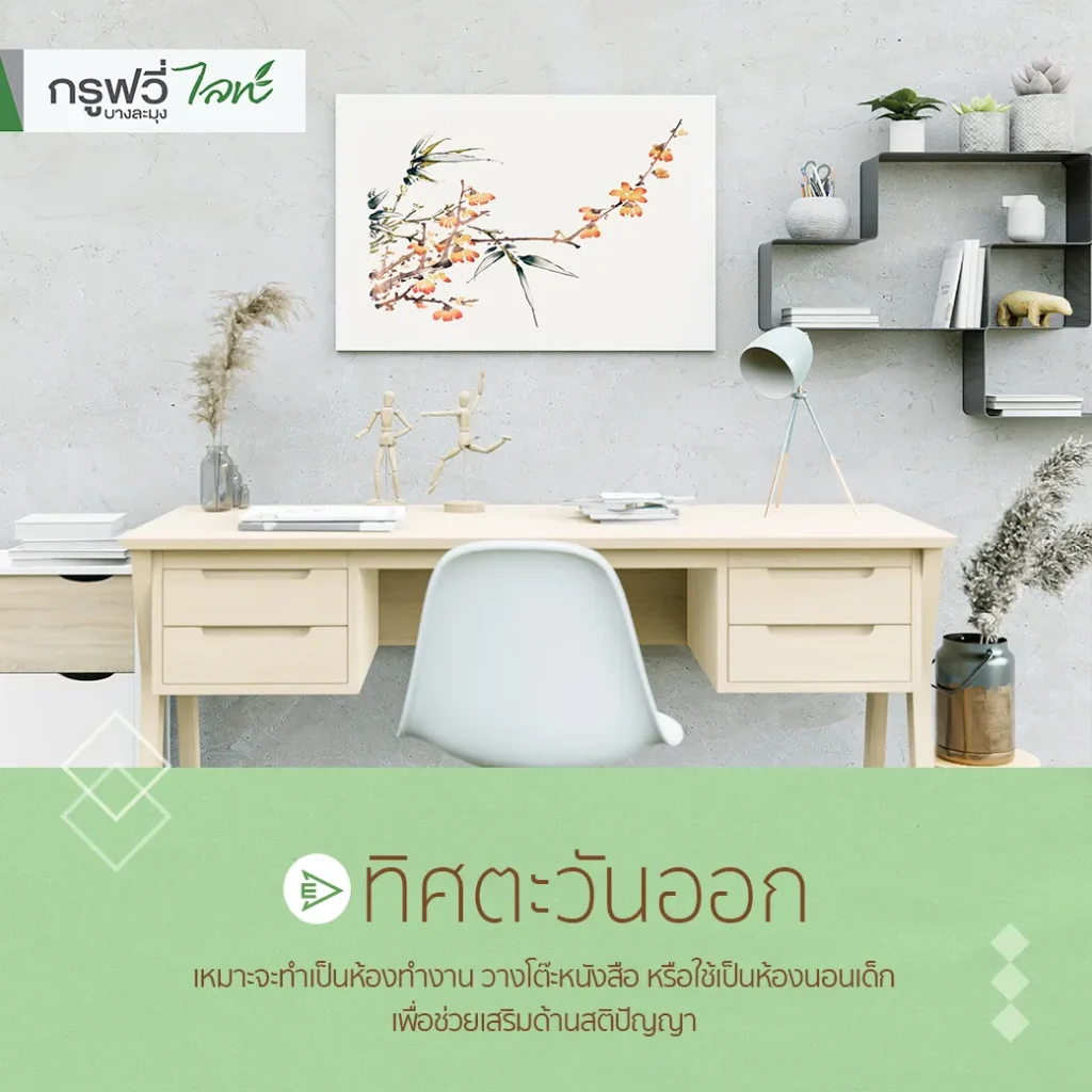 ในปีนี้ทิศตะวันออกมีดาวสี่เขียวมาเยือน ซึ่งเป็นดาวแห่งความฉลาด ความสามารถ และโชคด้านความสัมพันธ์ จึงทำให้บริเวณนี้เหมาะจะทำเป็นห้องทำงาน โฮมออฟฟิศ วางโต๊ะหนังสือ หรือประยุกต์ใช้เป็นห้องนอนเด็ก เพื่อช่วยเสริมด้านสติปัญญา นอกจากนี้ยังสามารถหาภาพเขียนพู่กันจีน หรือวัตถุมงคลต่าง ๆ มาประดับบ้าน