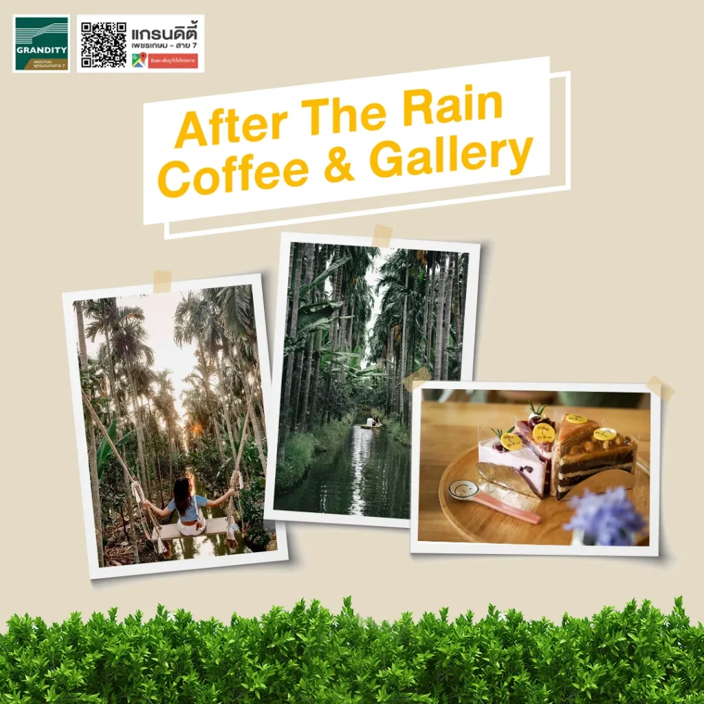 มาต่อกันที่ร้านกาแฟเล็กๆ น่ารักๆ สไตล์มินิมอลอย่าง “After The Rain Coffee & Gallery” ที่ร่มรื่นมากๆ เพราะอยู่ใจกลางสวนมะนาว มะพร้าว และต้นหมาก ตัวร้านเป็นเรือนกระจกขนาดเล็ก ตกแต่งเรียบง่าย มีมุมที่นั่งจิบเครื่องดื่มทั้งด้านในที่เป็นแบบห้องแอร์ และด้านนอกเป็นแบบโอเพ่นแอร์
