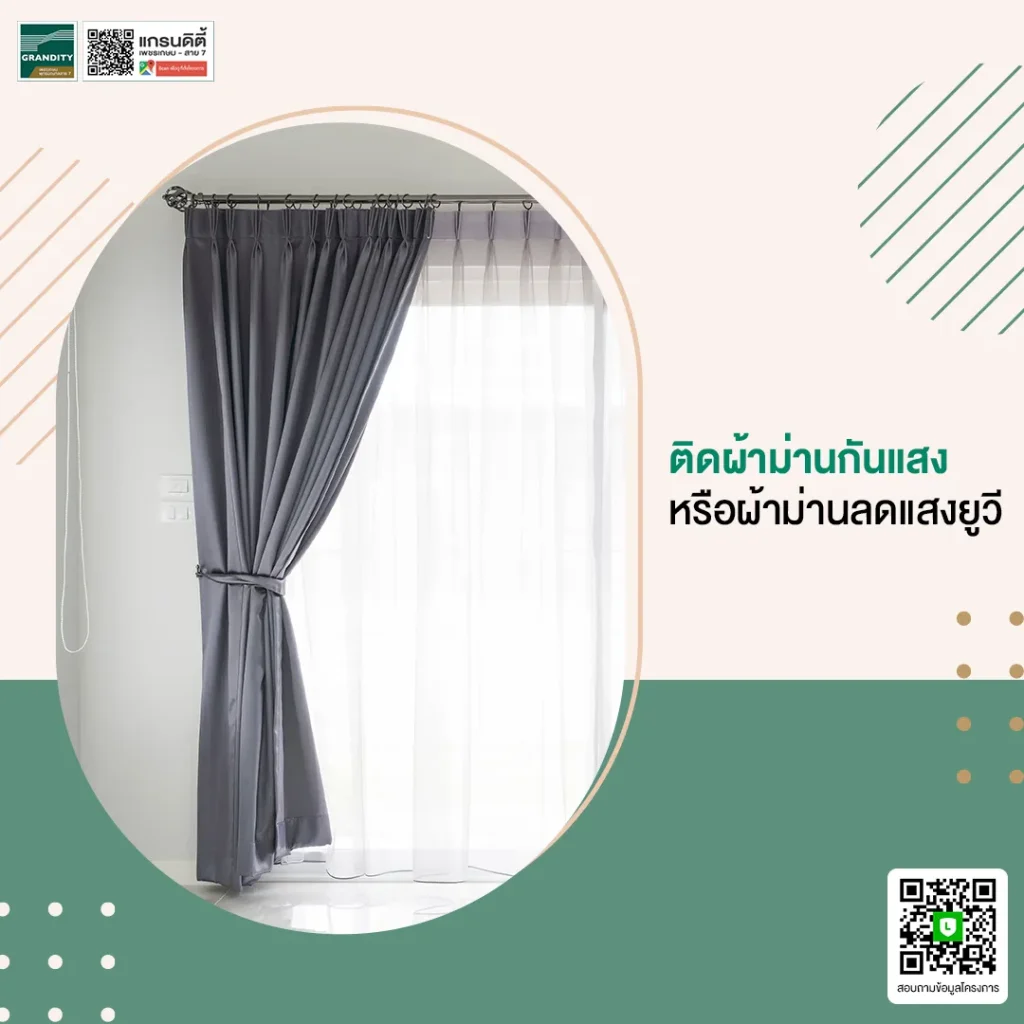 ในเมื่อเราไม่สามารถหลบเลี่ยงบ้านจากแสงแดดได้ การติดผ้าม่านกันแสง หรือผ้าม่านลดแสงยูวี สามารถช่วยลดอุณหภูมิภายในบ้านได้ โดยเนื้อผ้าม่านชนิดนี้ส่วนใหญ่ จะมีส่วนผสมของเส้นใยโพลีเอสเตอร์ ซึ่งมีคุณสมบัติสามารถคงสภาพได้ดี ยืดหยุ่น ไม่ยับง่าย แต่อากาศจะไหลผ่านเข้าออกได้ดี สามารถทนความร้อนได้ดี